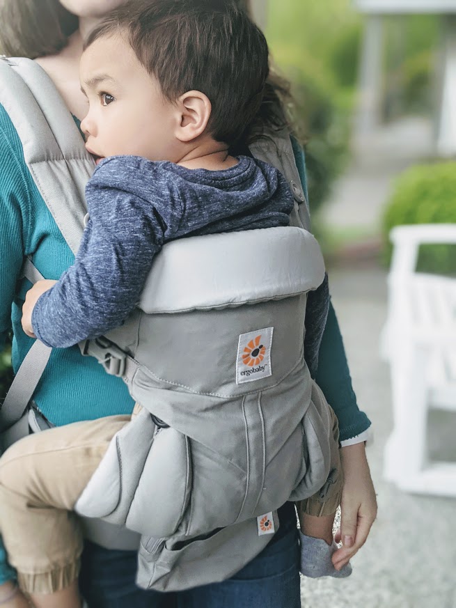 This feature makes it feel more secure as you are putting your baby in, as you don’t have to put the shoulder straps on while supporting your baby like with the Ergobaby carrier. And it makes it easy to switch the baby from a front carry to a back carry because the child is secure in the carrier as you readjust the straps for your shoulders. This design also seems to cause the weight of the baby to pull more comfortably downward instead of a slight forward pull on your shoulders.