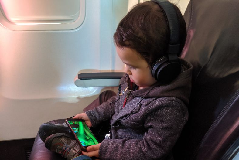 Toddler using headphones on the plane
